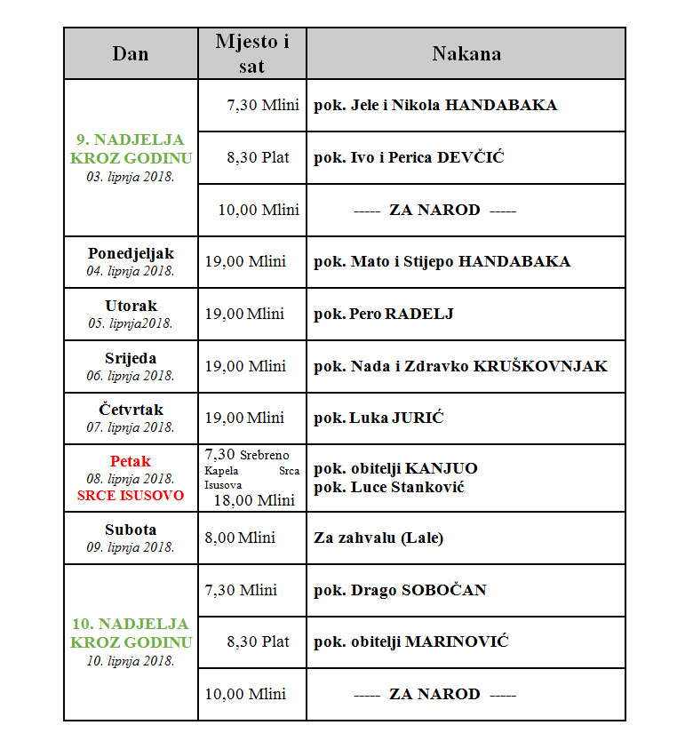 Misne nakane od 03. do 10. lipnja 2018. - 9. NEDJELJA KROZ GODINU